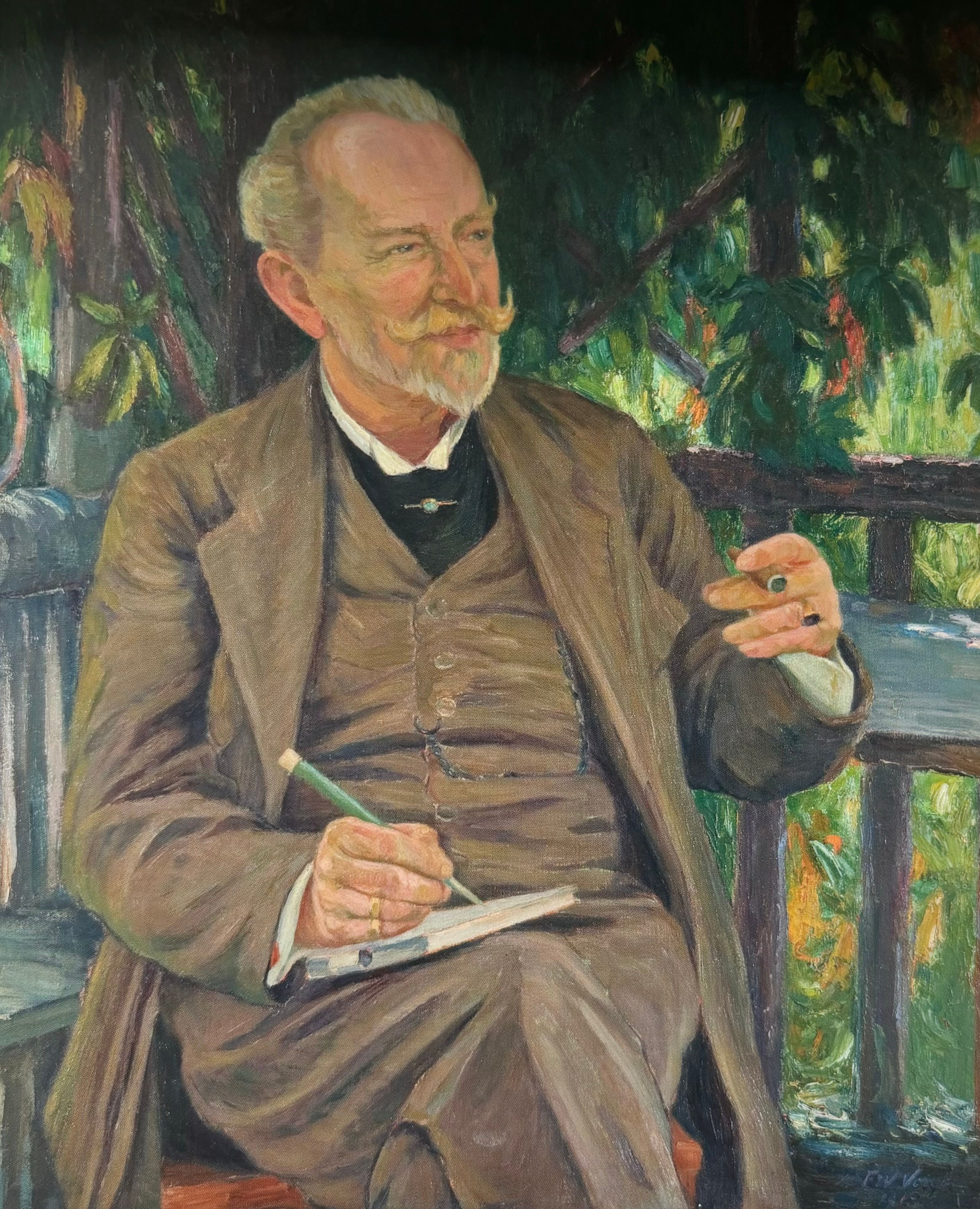 Franz Wilhelm Voigt, Carl Ernst Morgenstern, 1918, Öl auf Leinwand, Nationalmuseum Breslau (vgl. Fußnote)Einige Jahre nach den Portraits von Paul Ehrlich, die Voigt 1910 als Auftragsarbeiten angefertigt hatte, entstand sein Bildnis des Malers Carl Ernst Morgenstern (1847-1928).Der aus München stammende Künstler hatte ab 1883 an der Kunstgewerbeschule in Breslau eine Professur für Landschaftsmalerei inne. Er war ein Vorreiter der Plein Air Malerei nach dem Vorbild der Künstlerkolonie Barbizon. Voigt studierte zunächst in Breslau, ehe er 1888 erstmals nach München kam. Somit ist es wahrscheinlich, dass sich die Wege von Morgenstern und Voigt in den frühen 1880er Jahren bereits kreuzten.Später kam Morgenstern öfter mit seinem Sohn Christian zum Malen nach Weßling. Hier war auch Voigt von Oktober 1889 bis März 1890 als Untermieter bei einer Familie Lehmann gemeldet.Vielleicht sind sich die beiden Maler dort wieder begegnet.Voigt malte den Künstlerfreund in der Ecke einer Laube sitzend, gekleidet in einen dreiteiligen Anzug mit Weste, Hose und Sakko.Über dem schwarzen Plastron, das von einer goldenen Nadel mit zentralem Edelstein geziert wird, blitzt ein weißer schmaler Hemdkragen hervor. Der distinguierte ältere Herr mit seinem gepflegten Bärtchen hält in der linken Hand eine Zigarre. Er trägt einen Siegelring. Mit der rechten zeichnet er in ein Skizzenbuch, das auf seinem rechten Knie liegt. Die üppige sommerliche Vegetation hinterfängt den in Gedanken versunkenen Künstler wie eine Blätterwand. Ellen Mey schreibt in ihrer Monographie über die Freundschaft der beiden Maler: „Der Kreis der Künstlerfreunde hatte sich merklich gelichtet, freundschaftliche Kontakte bestanden nach wie vor zu dem „Riesengebirgsmaler“ Carl Ernst Morgenstern [...]. Der ihm aus Studientagen bekannte Lehrer der Breslauer Kunstschule verbrachte nach dem Rückzug von seinem Lehramt 1913 und dem frühen Tod seines Sohnes, des Dichters Christian Morgenstern (1871-1914), die Sommermonate 1914 bis 1918 in Weßling. So hatte Voigt Gelegenheit, die alte Bekanntschaft wieder aufzufrischen“ (Mey, S. 21-22).Die Nachkommen Voigts vermuten, dass das Bildnis in Gauting aus Anlass des siebzigsten Geburtstags von Morgenstern am 14. September 1918 entstanden ist.Es wurde 1920 vom Schlesischen Museum der Bildenden Künste in Breslau angekauft und befindet sich heute im Nationalmuseum Breslau (Muzeum Narodowe we Wrocławiu). Dort konnten es der Großneffe des Malers und seine Frau 2010 besichtigen. Klebezettel auf der Rückseite belegen, dass das Bild nach Ende des Zweiten Weltkriegs zwischenzeitlich im Bestand des Nationalmuseums in Warschau war.Fußnote: Die Abbildung ist dem Buch von Ellen Mey entnommen.LITERATURMey, Ellen: Der Maler Franz Wilhelm Voigt und die Künstlervereinigung „Scholle“, 69. Bericht des Nordoberfänkischen Vereins für Natur-, Geschichts- und Landeskunde, Hof 2017.Stadtarchiv München, EWK 65 F 151, Einwohnermeldekarte, Gustav Franz Wilhelm Voigt und Barbara Voigt, geb. Wolf.Wendebourg, Eva-Andrea: Franz Wilhelm Voigt (1867-1949), Ein Maler der „Scholle”, Regensburg 2015.Teilen